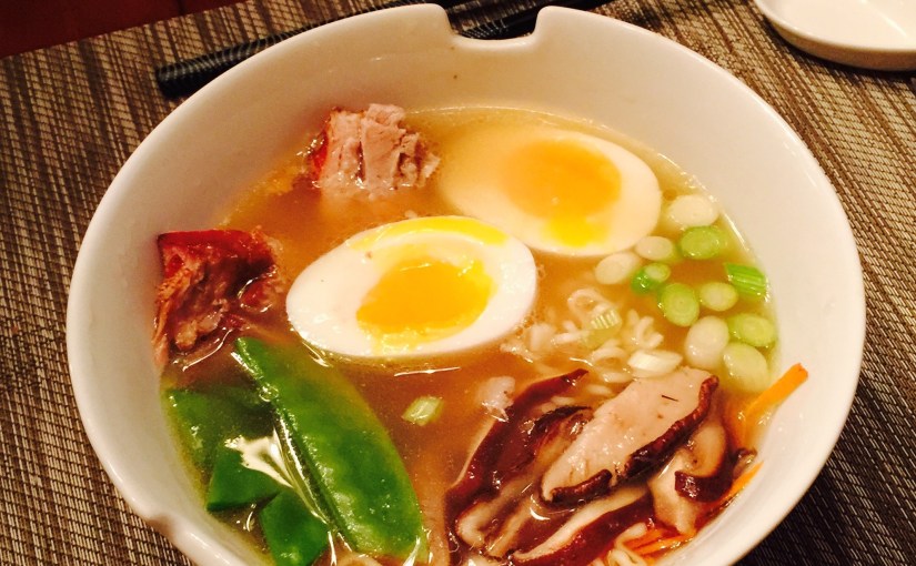 I am not certain it is possible to make authentic ramen in an apartment kitchen and in a short amount of time, but our family loves this recipe (whether it is truly authentic or not) which mixes techniques from a number of cooks (David Chang, Food Lab, and others) to make a pretty wonderful weeknight meal. If you want to make it more special–and you have a few hours to let pork belly very slowly braise–it makes a great centerpiece to the dish and raises the elegance level dramatically (braised pork belly recipe follows). This recipe serves two, but can easily be doubled or tripled.