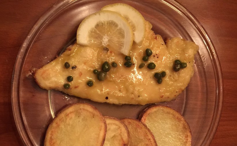 This is a quick and lighter version of Chicken Piccata. It can be served with pasta, rice, potatoes or just with an assortment of roasted or steamed vegetables. This recipe is meant for two but it can easily be doubled (although if you want it all done at once you will need more than one frying pan). It has been a favorite in our house for a very long time.