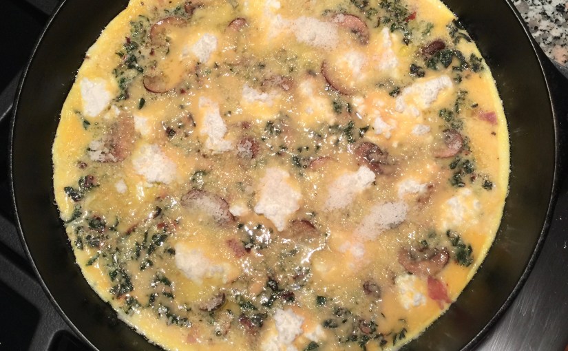 This recipe is one of the easiest to make, is almost infinitely adaptable, and is just as good for dinner as it is for breakfast or brunch. You can even treat it like a pizza and put one set of fillings on one half and a different on the other. It is best made in a cast iron pan but, if you don’t have a very well seasoned one, any pan that go in the oven as well as on top of the stove will do.