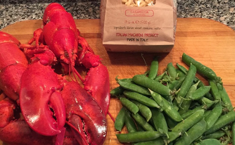 This is a quintessential summer dish and is best when you can get fresh peas and pea sprouts.  You can make it much more quickly and easily if you can get the lobsters boiled by your fish market or supermarket.
