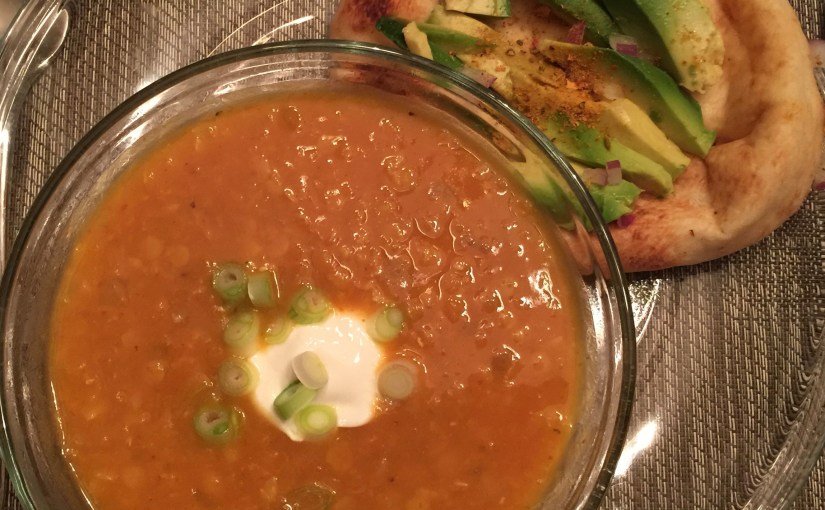 This is a very quick but warming and filling soup to have as a main course. Red lentils are critical because they are split and quick much faster than other lentils.  They are also sold under the name Masoor Dal.