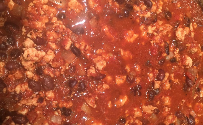 - Place 1 T. of olive oil in a large heavy pot (big enough to hold the chili) over medium heat. When heated, add the ground turkey and break up as needed with a wooden spoon. Cook, stirring often until the turkey is fully cooked.
