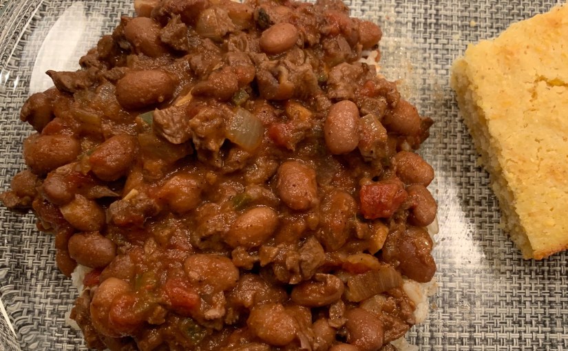 This is a complex chili based on many of the components traditional Texas chili, but with the apostasy of bean added (sorry! but I really like beans both for flavor and texture and as a way to make this more economical). This is a chili that can come together very quickly on a weeknight if you use the short cuts/substitutions (ground beef and canned beans). If you have the time, however, it is worth doing the extra work of chopping meat and soaking beans because they add a real richness to the final product.