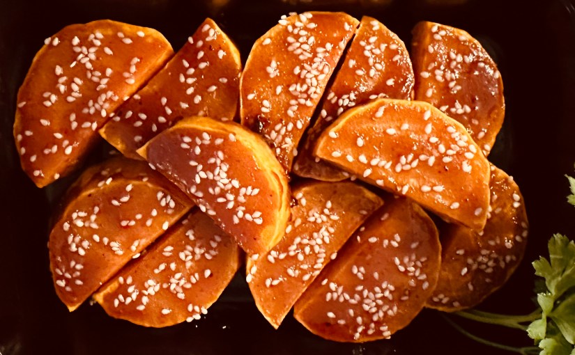 8. When the squash is just tender when a knife tip is inserted into it (20 -30 minutes depending on the thickness and freshness of the of the squash), remove from the oven and paint thickly with the hoisin-ginger sauce letting it drip down the sides (but not so generously extra sauce is pooling in the pan as it will burn). You will probably have a little sauce left over.